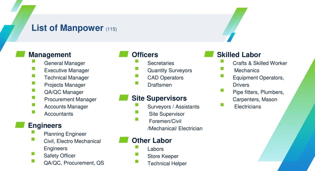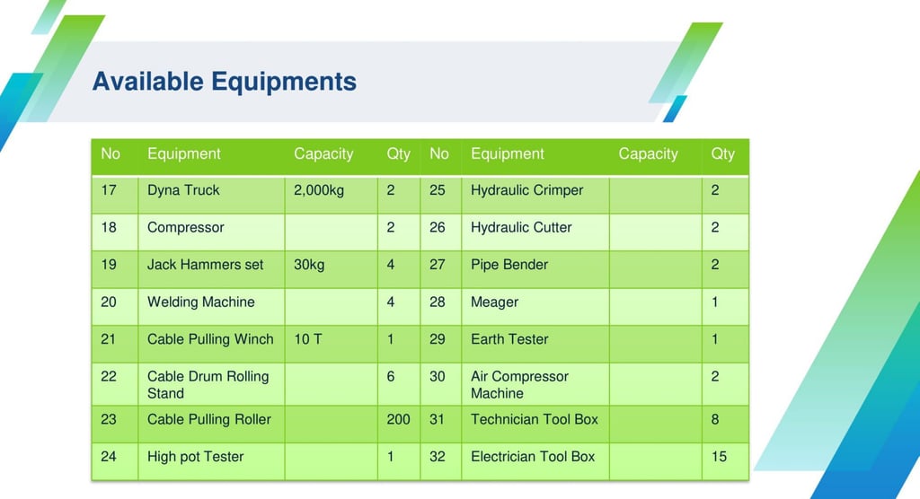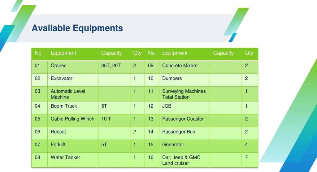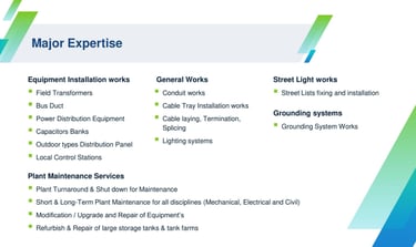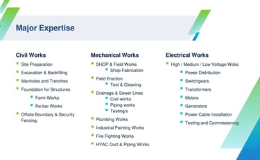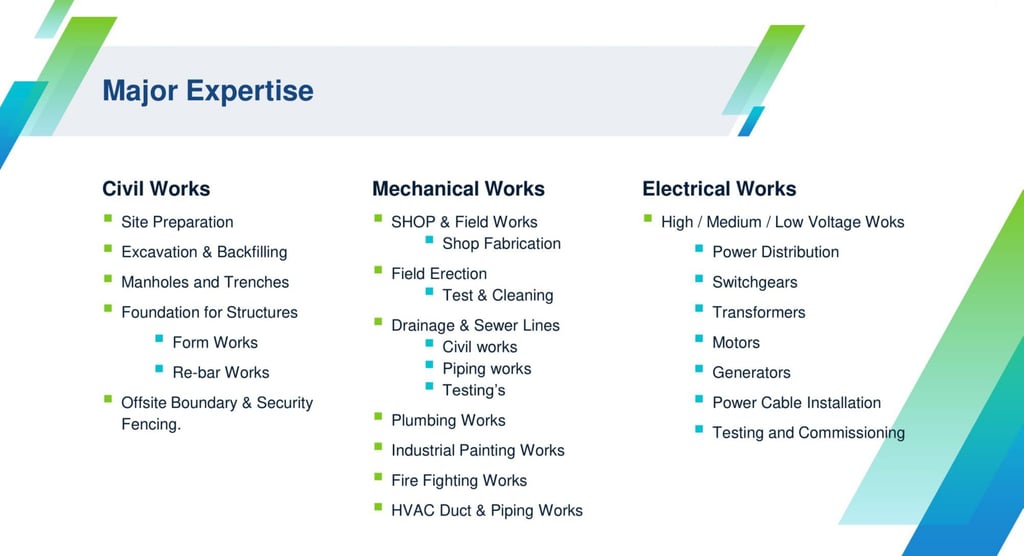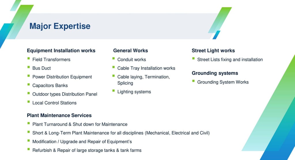 Expertise in oil drilling, road paving, telecommunications, construction, and interior decoration in Saudi Arabia.